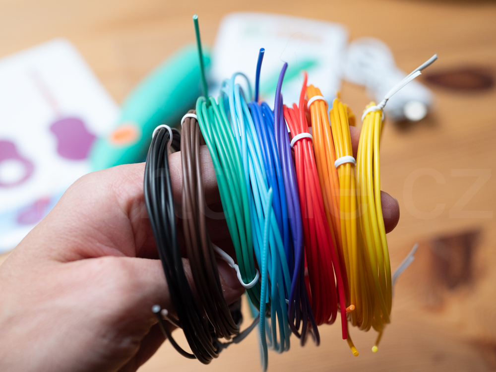 V naší základní sadě naleznete pero pro 3D tisk, které je dobíjecí pomocí USB kabelu (ten je součástí balení). Dál najdete 10 barevných náplní, každou o délce 2 metry. 10 kartiček se šablonami a průhlednou folii, na kterou se kreslí a snadno se z ní výtvor sloupne.