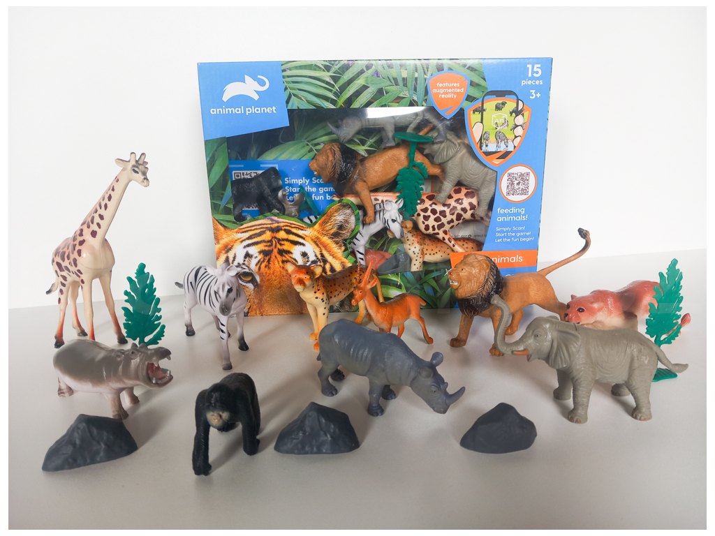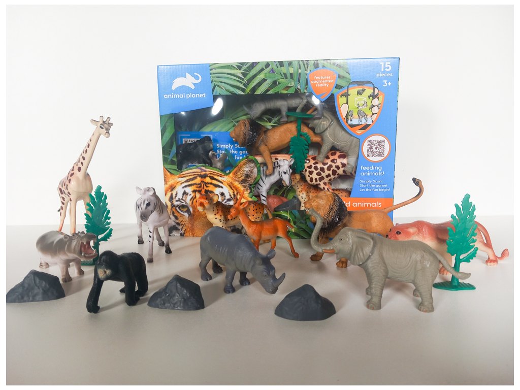 Tato krabička nabízí i QR kód. Po naskenování se Vám zobrazí aplikace pro rozšířenou realitu AR. Mobilní aplikace slouží pro zobrazení zvířátek. Hračka je licencována Animal Planet a je vyrobena z recyklovaných materiálů. Svoji šetrnot k přírodě vyjadřuje i barvením inkousty Soy-Based. Hračka je proto Eco-Friendly.