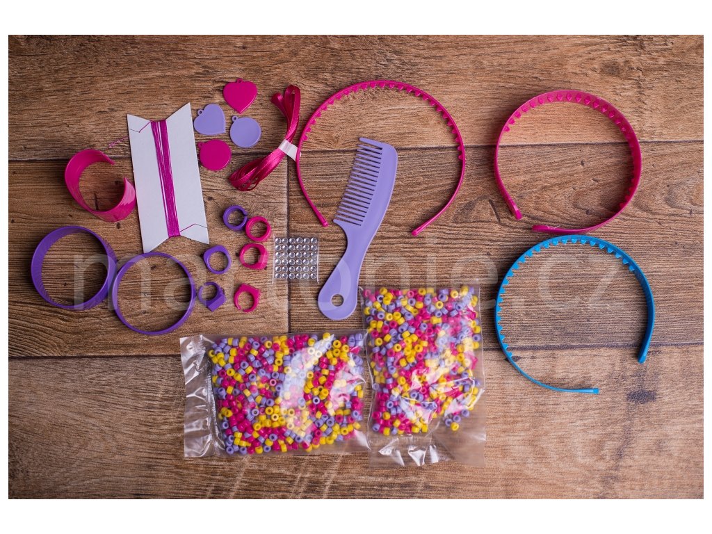 V sadě najdete základy čelenek, náramků, prstýnků a spoustu korálků, nálepek a mašličky, abyste mohly tyto šperky dotvořit podle sebe. Můžete si pak složit dárkové krabičky a některé vlastnoruční šperky věnovat třeba kamarádce jako dáreček.