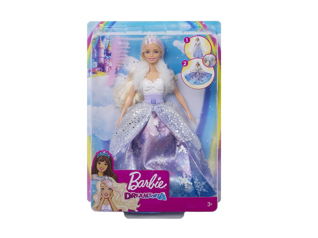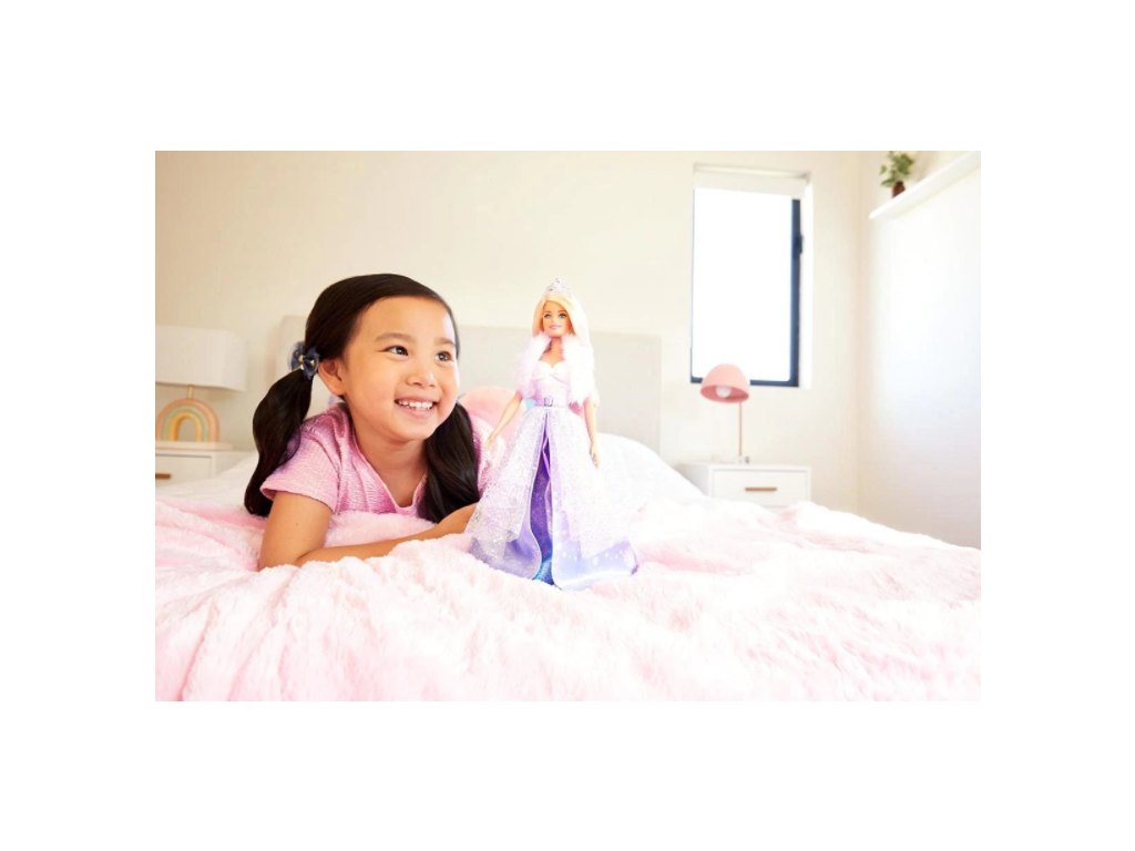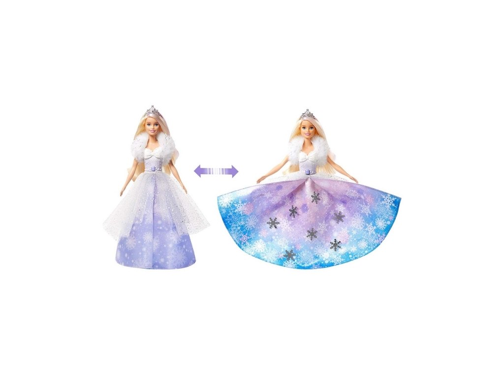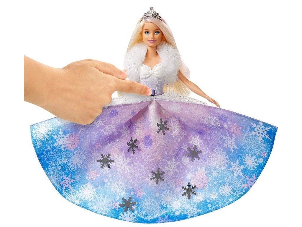 Užijte si společně s princeznou♛ Barbie spoustu zábavy v královském stylu. Barbie® se u této příležitosti oblékla do překrásných večerních šatů. Bohatě zdobenou sukni v ledově modré a levandulové barvě zdobí motivy sněhových vloček ❄︎ a jemná třpytivá látka.