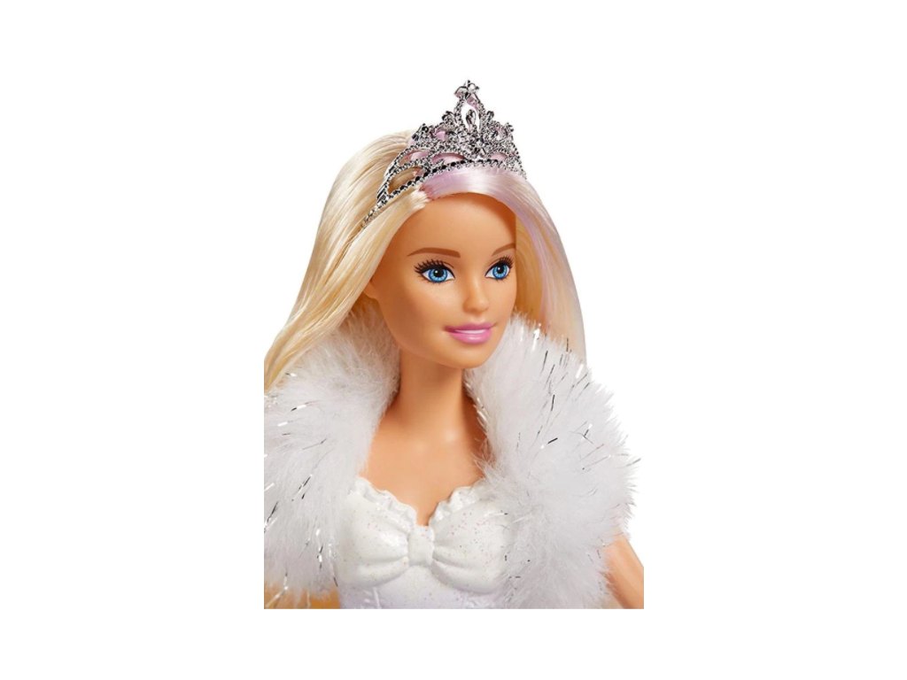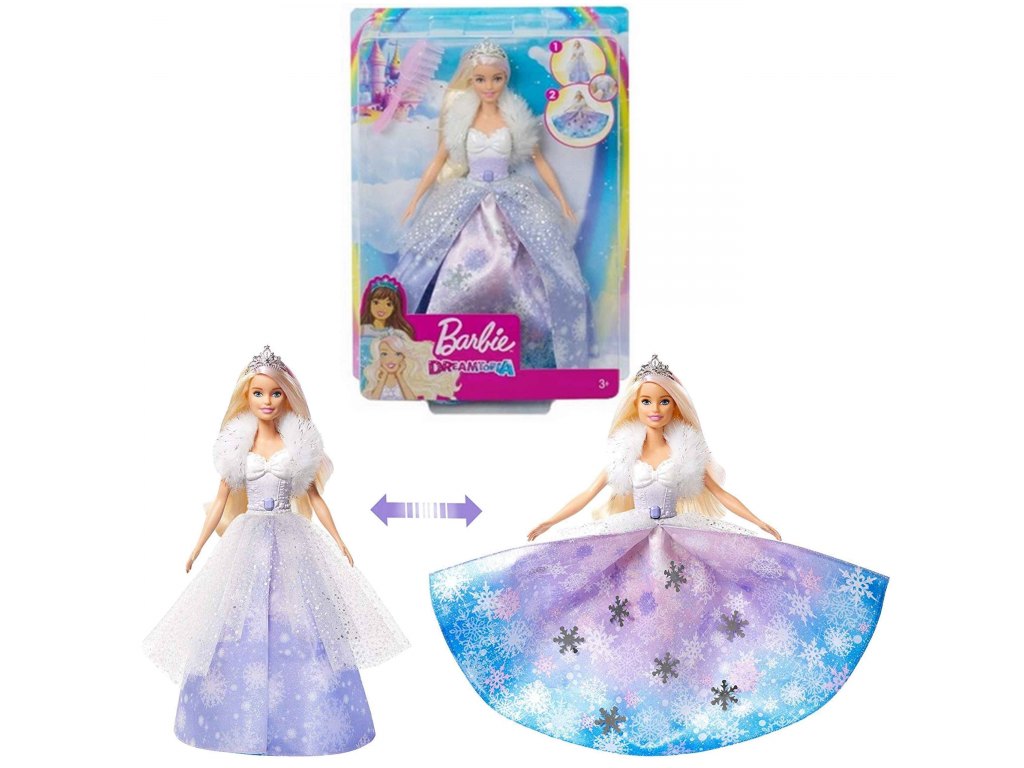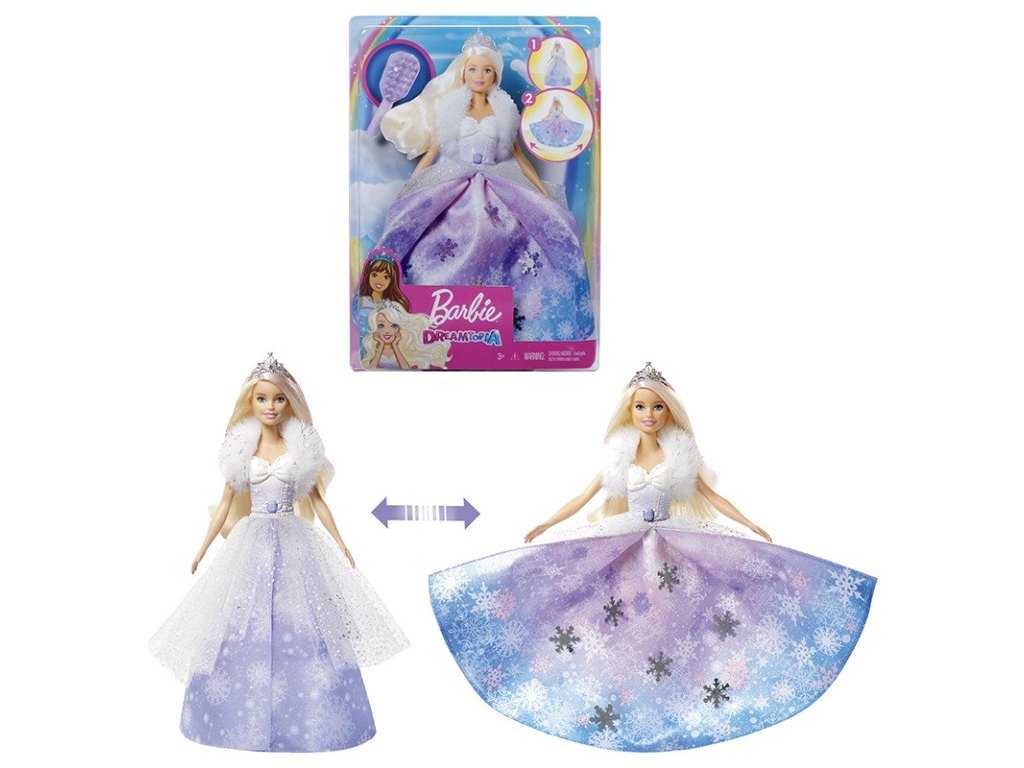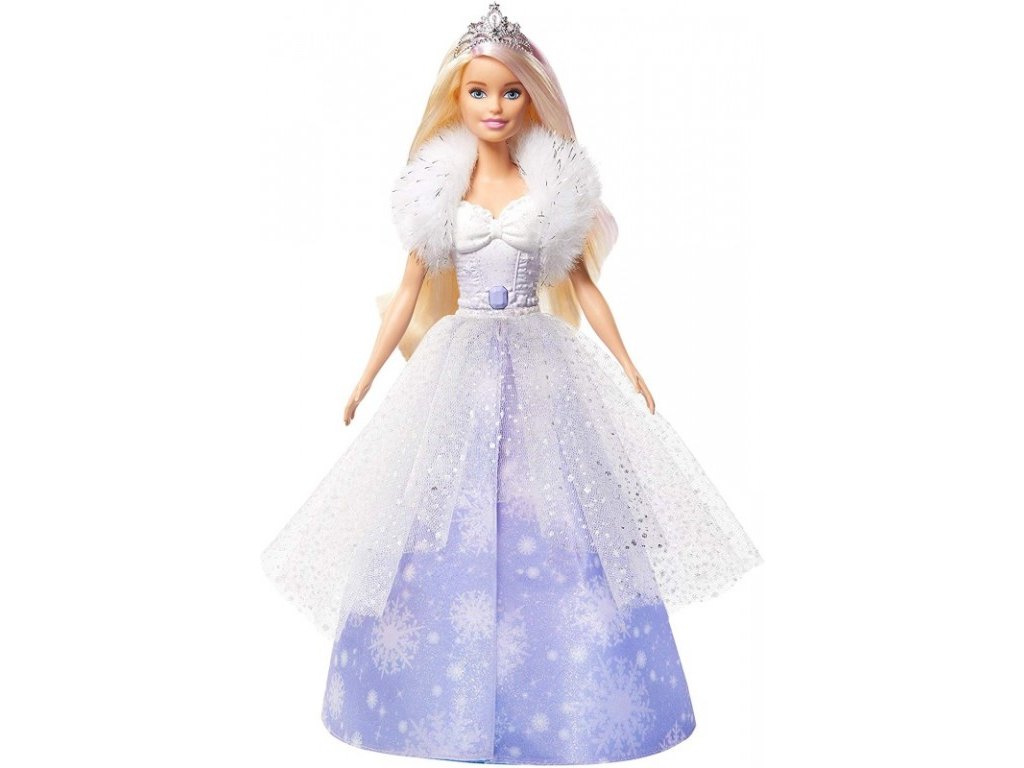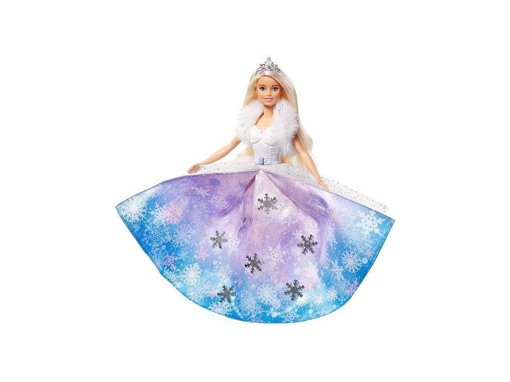 Užijte si společně s princeznou♛ Barbie spoustu zábavy v královském stylu. Barbie® se u této příležitosti oblékla do překrásných večerních šatů. Bohatě zdobenou sukni v ledově modré a levandulové barvě zdobí motivy sněhových vloček ❄︎ a jemná třpytivá látka.