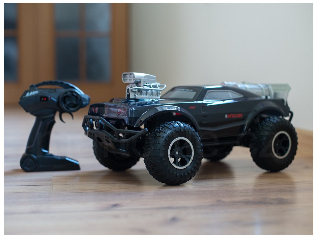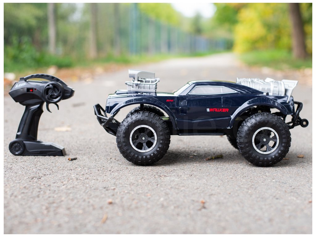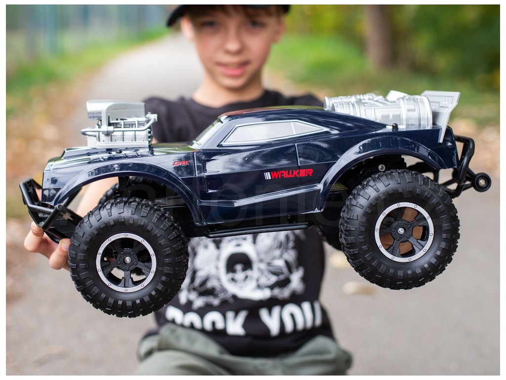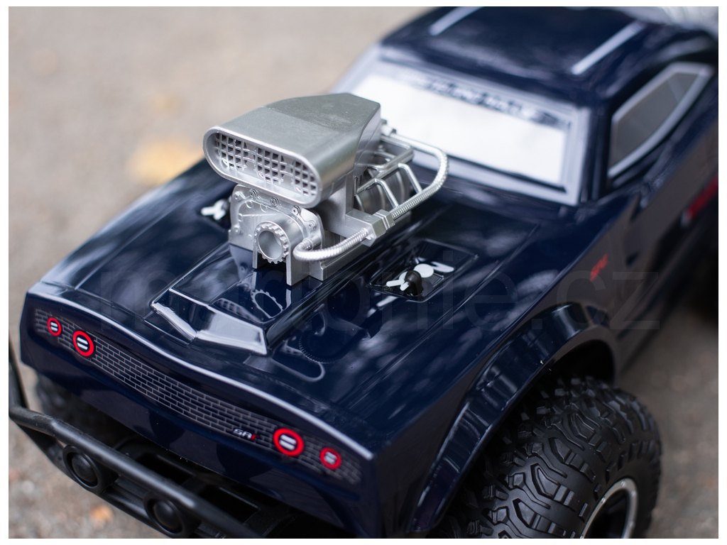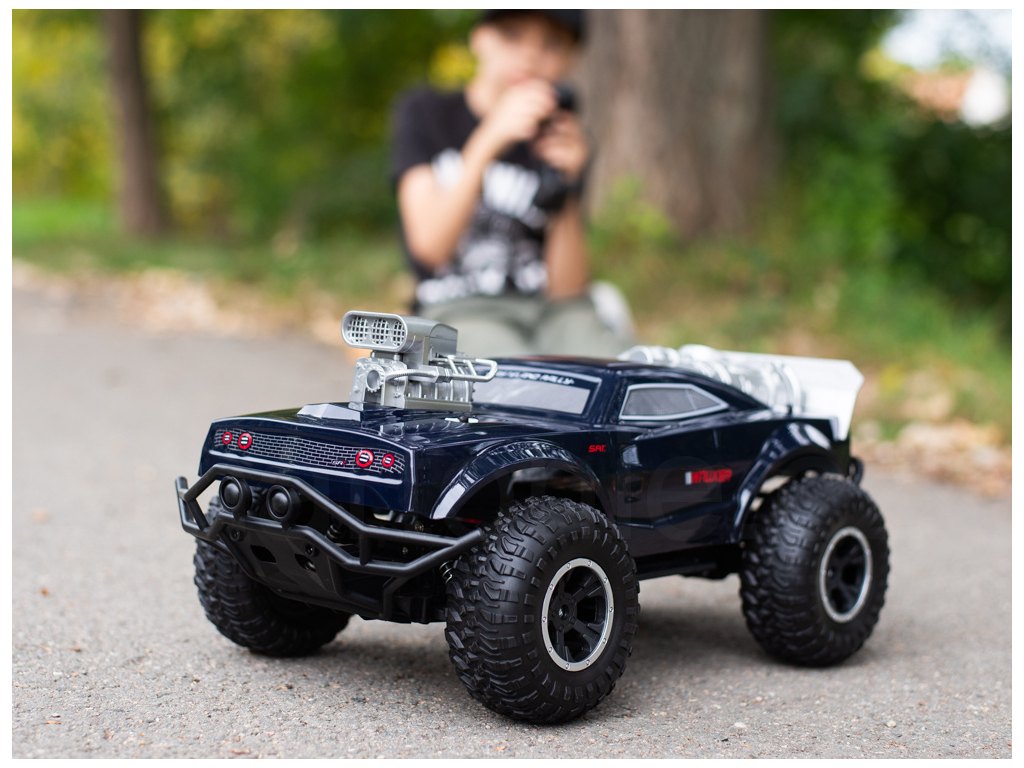 Temně modré terénní auto na doma i na ven potěší každého závodníka. Auto má velká kola, která jsou měkká a tak je ideální pro jízdu na doma, protože neničí plovoucí podlahy a nedělají rámus. Auto se velmi dobře ovládá, má pistolový dálkový ovladač. Doporučený věk je 6 let, ale určitě zvládnou i děti mladší. Vepředu i vzadu má auto nárazník, aby v případě ťuknutí bylo auto chráněno.