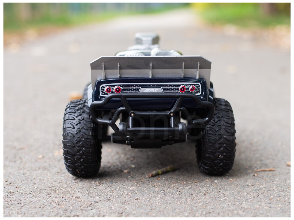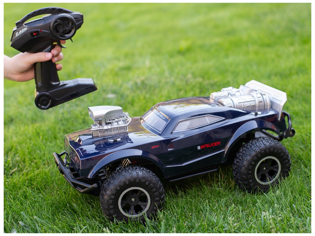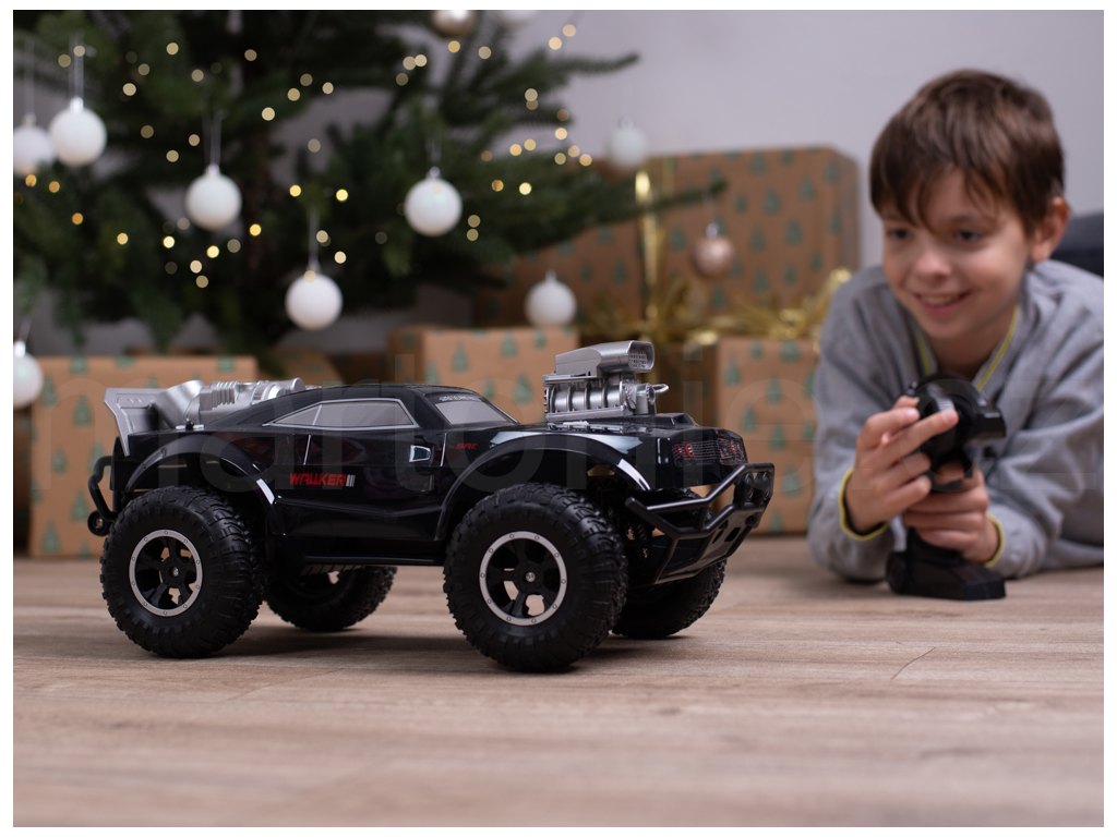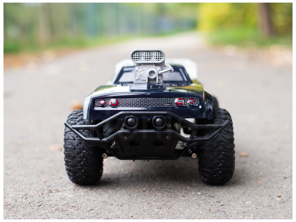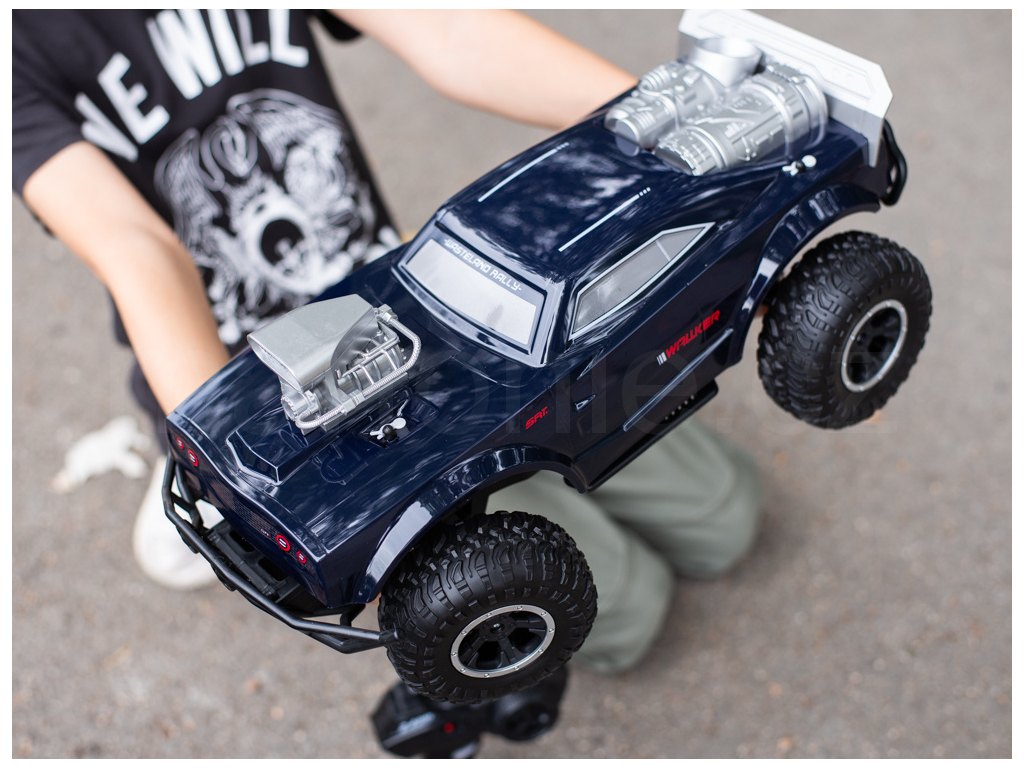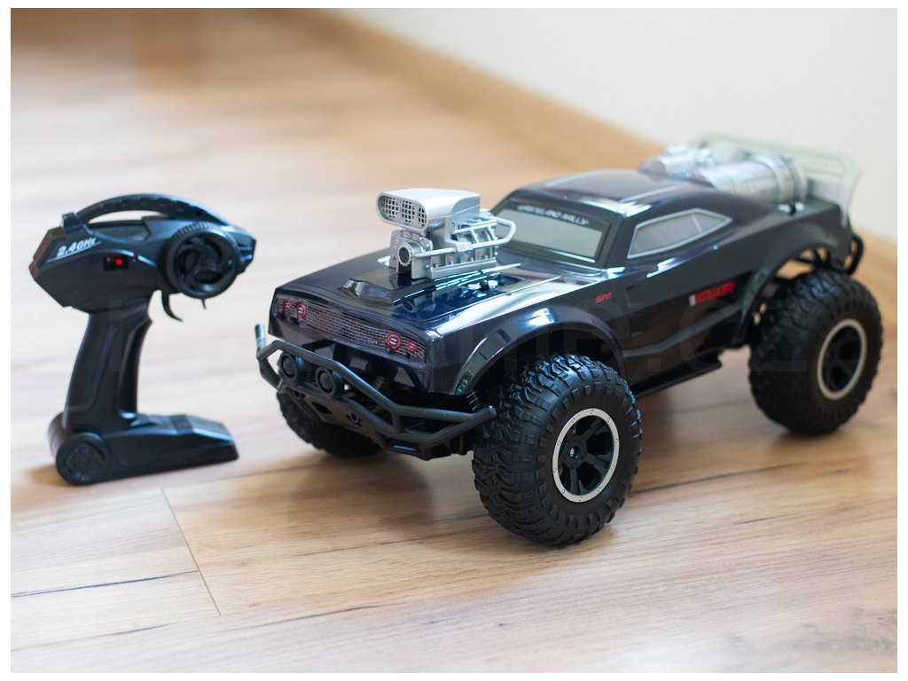 Temně modré terénní auto na doma i na ven potěší každého závodníka. Auto má velká kola, která jsou měkká a tak je ideální pro jízdu na doma, protože neničí plovoucí podlahy a nedělají rámus. Auto se velmi dobře ovládá, má pistolový dálkový ovladač. Doporučený věk je 6 let, ale určitě zvládnou i děti mladší. Vepředu i vzadu má auto nárazník, aby v případě ťuknutí bylo auto chráněno.