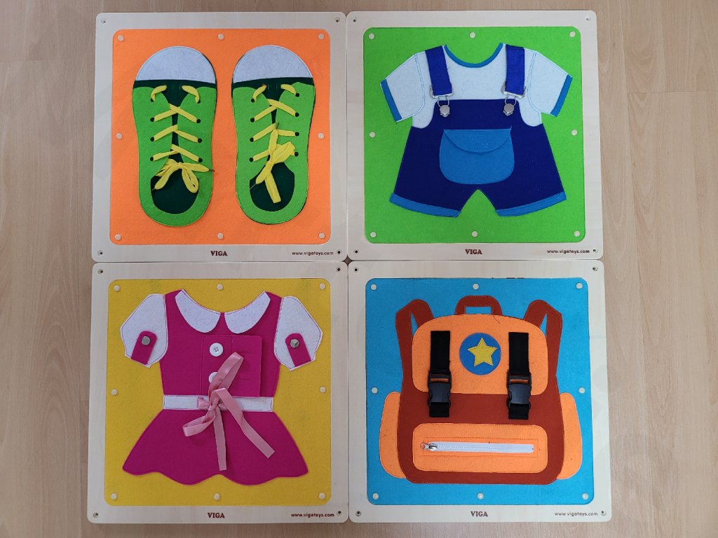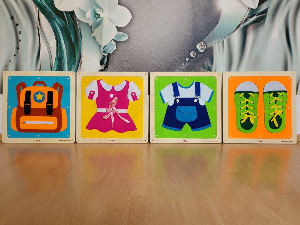 4v1 Nástěnná dřevěná motorická hra - oblékání, zapínání