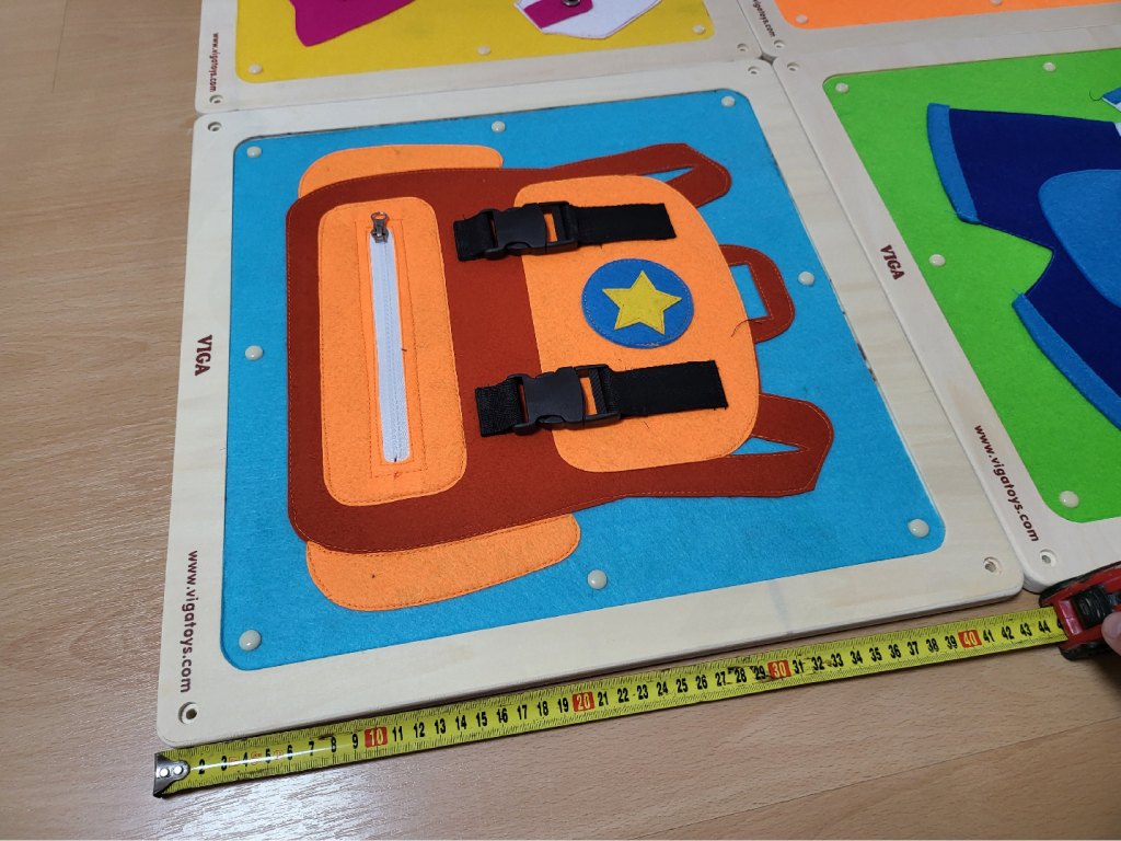 Nástěnná hra na trénování motorky a potřebností každodenního života se skládá ze 4 dílů. Každý díl měří 44 x 44 cm a přidělává se na zeď pomocí šroubů. Jak naučit děti zavazovat tkaničky, zapínat batůžek nebo knoflíky? Snadno s tímto výukovým nástěnným panelem.