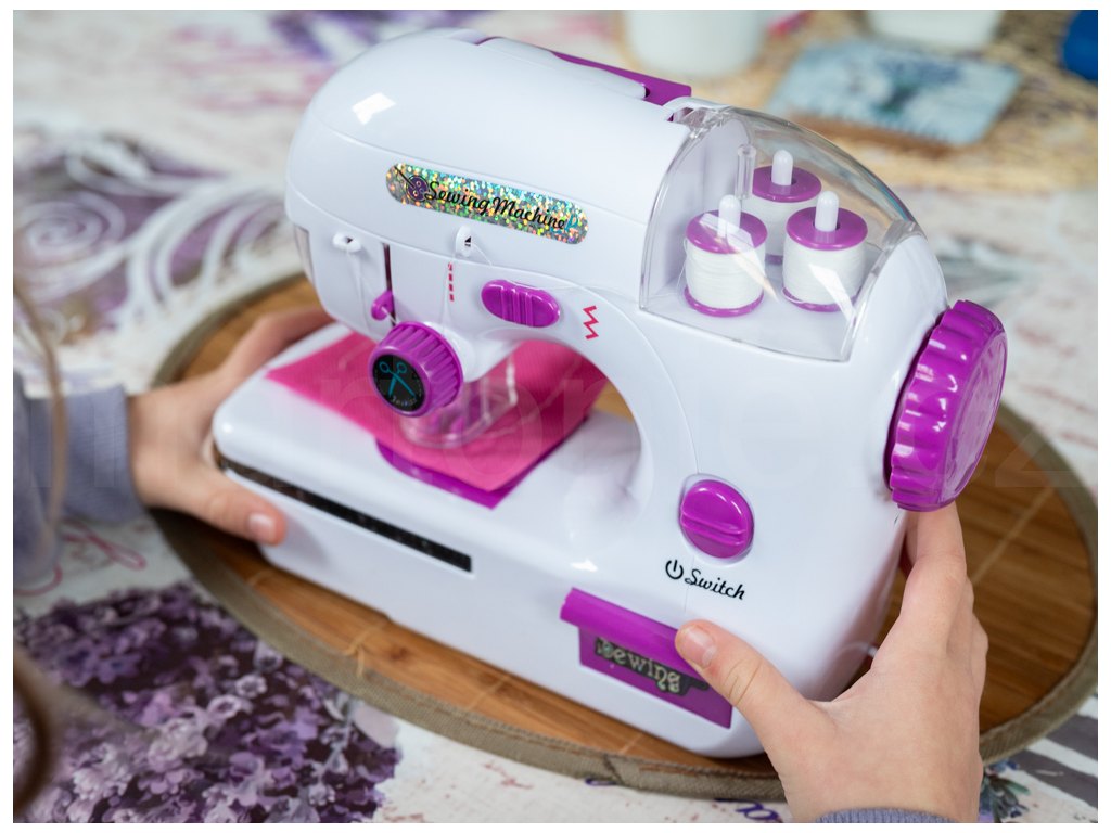 # šicí stroj pro děti # dětský šicí stroj # pro holčičky # malá švadlenka # základy šití # šicí stroj hračka # malý šicí stroj # na baterie # dobíjecí # bílo fialový # bezpečný šicí stroj # chránič jehly # šicí stroj s chráničem # přenosný # funkční šicí stroj na hraní # s příslušenstvím # cívka s nití #