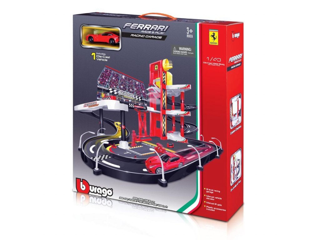 S nadšením krabici otevřete a vytáhnete garáž se 3 úrovněmi, která je vyrobena z velmi kvalitních plastů. V setu najdete dvě krásná kovová autíčka: Ferrari 430 Scuderia (červená) Ferrari Enzo (žlutá). Autíčka, jako všechna autíčka od značky Bburago jsou luxusními a věrnými modely svých velkých předloh v měřítku 1:43 (cca 10 cm). Garáž má výtah, který funguje pomocí kliky, takže když budete točit s klikou, výtah bude jezdit nahoru, dolů a autíčko snadno vyvezete, kam jen budete chtít.