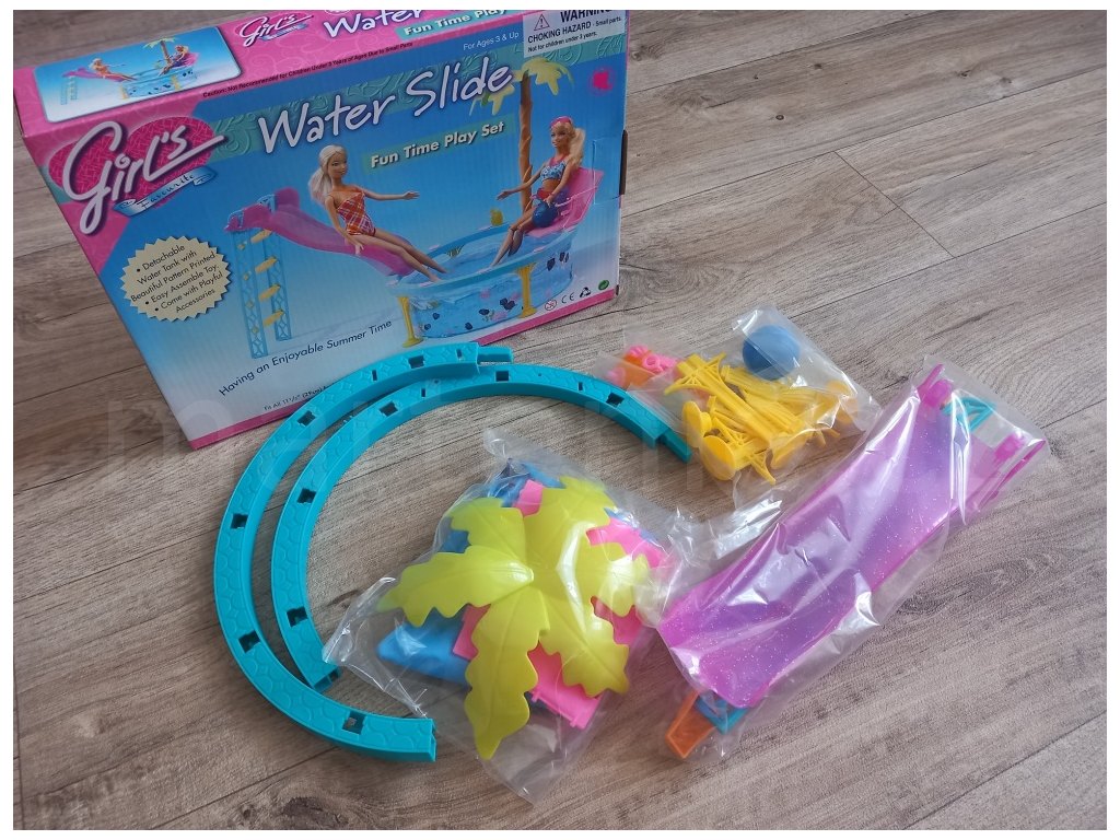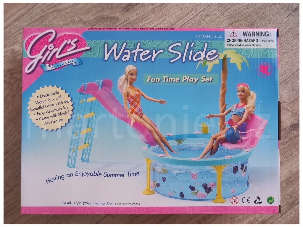 Glorie bazén obsahuje bazének, palmu, skluzavku a sedačku pro panenky. Panenky nejsou součástí balení. Rozměry balení cca 33 x 24 x 6,5 cm. Rozměry bazénu cca 10 x 29 cm, skluzavky 25 x 25 cm, palmy 32 cm. Věk 3+