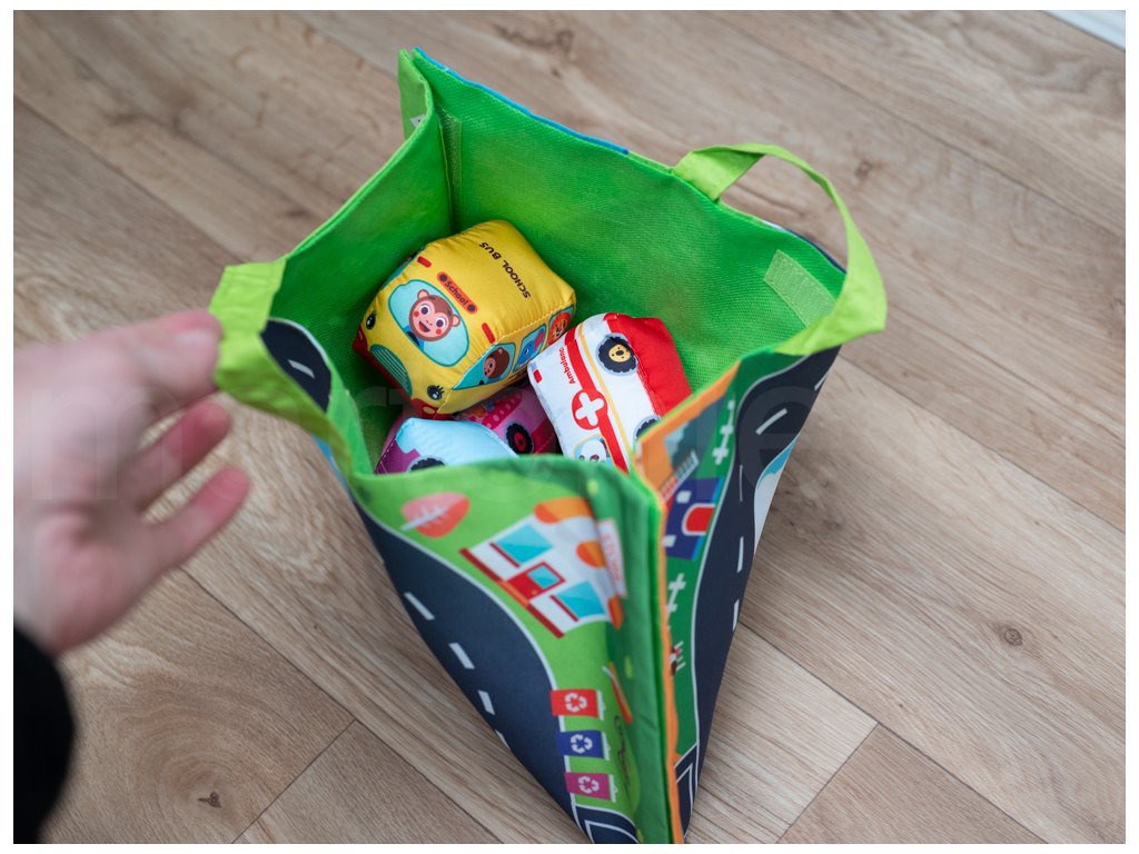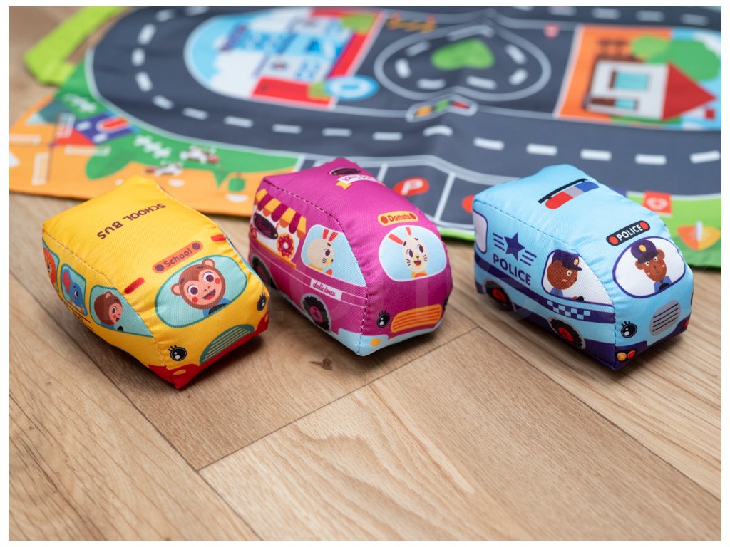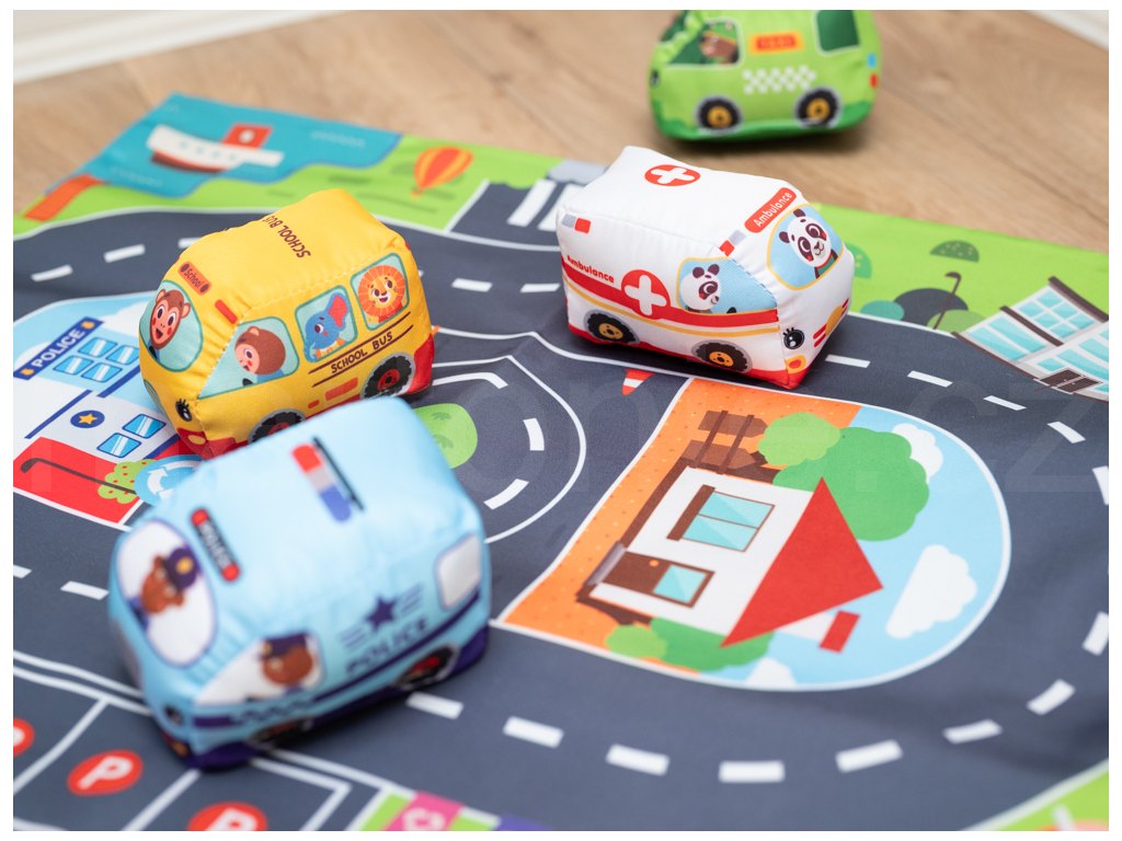 Jedna z prvních hraček pro miminka. Ideální první autíčka pro nejmenší děti. Textilní podložka se silnicemi a natištěnými dopravními značkami a domečky má dvě ucha a suché zipy, takže jak skončí hra, můžete podložku proměnit v přenosnou tašku a všechna autíčka do ní uklidit.