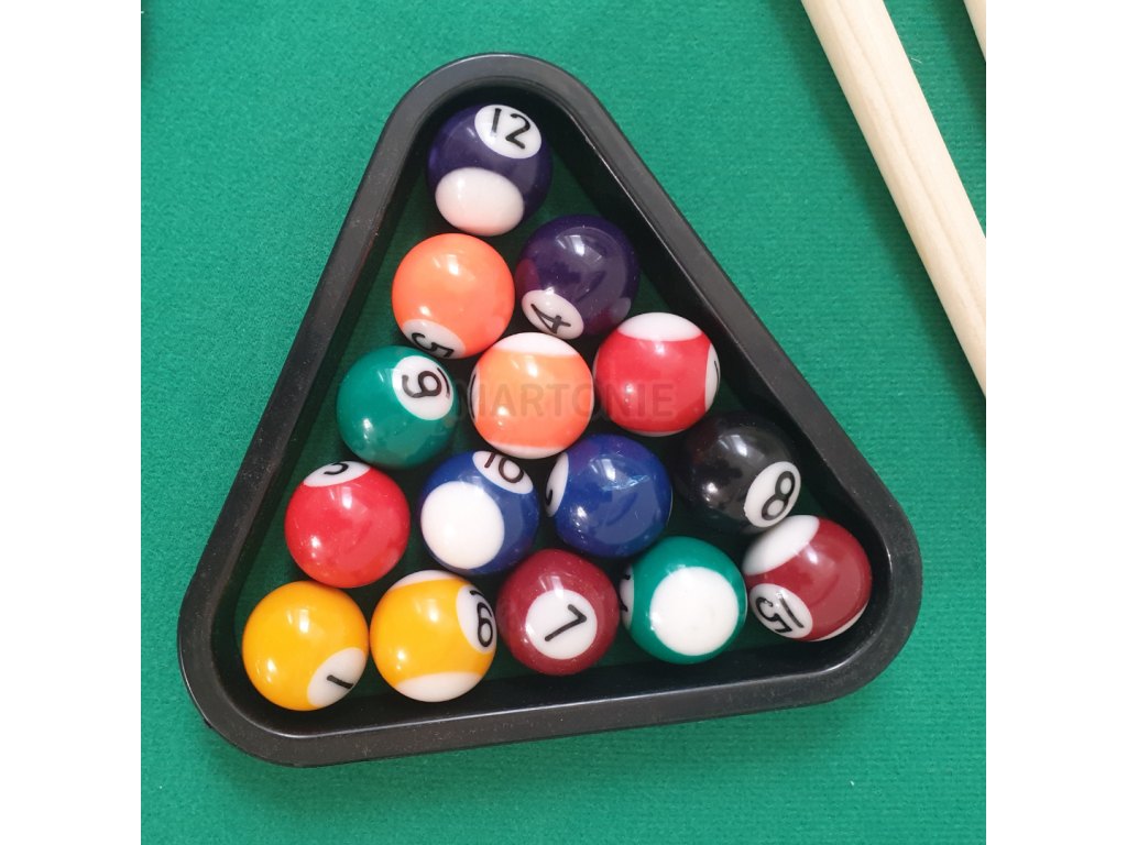 - Obsahuje: dvě tága, 16 koulí, trojúhelník pro uspořádání koulí při začátku hry a křídu na protiskluzovou úpravu hrotu tága