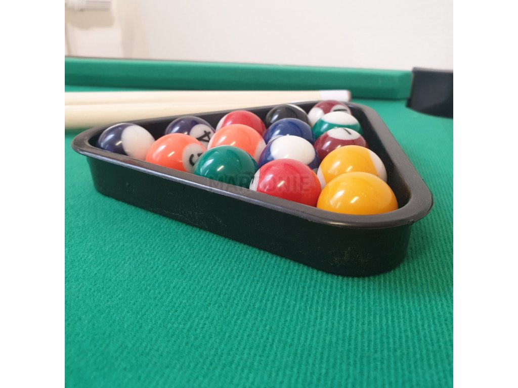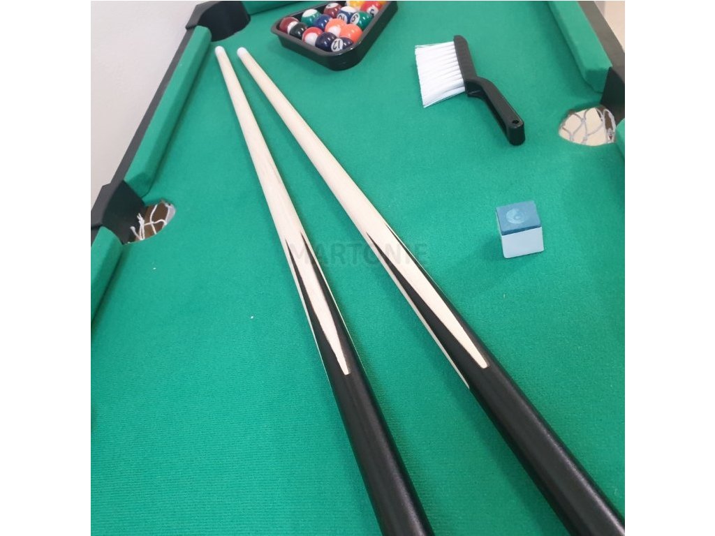 Kulečníkový stůl je v kvalitním dřevěném provedení a v balením kromě kulečníkového stolu najdete: 16 koulí, trojúhelník pro úpravu na rozstřel, křídu k pro "navoskování" tága a samozřejmě právě dvě zmíněná tága.