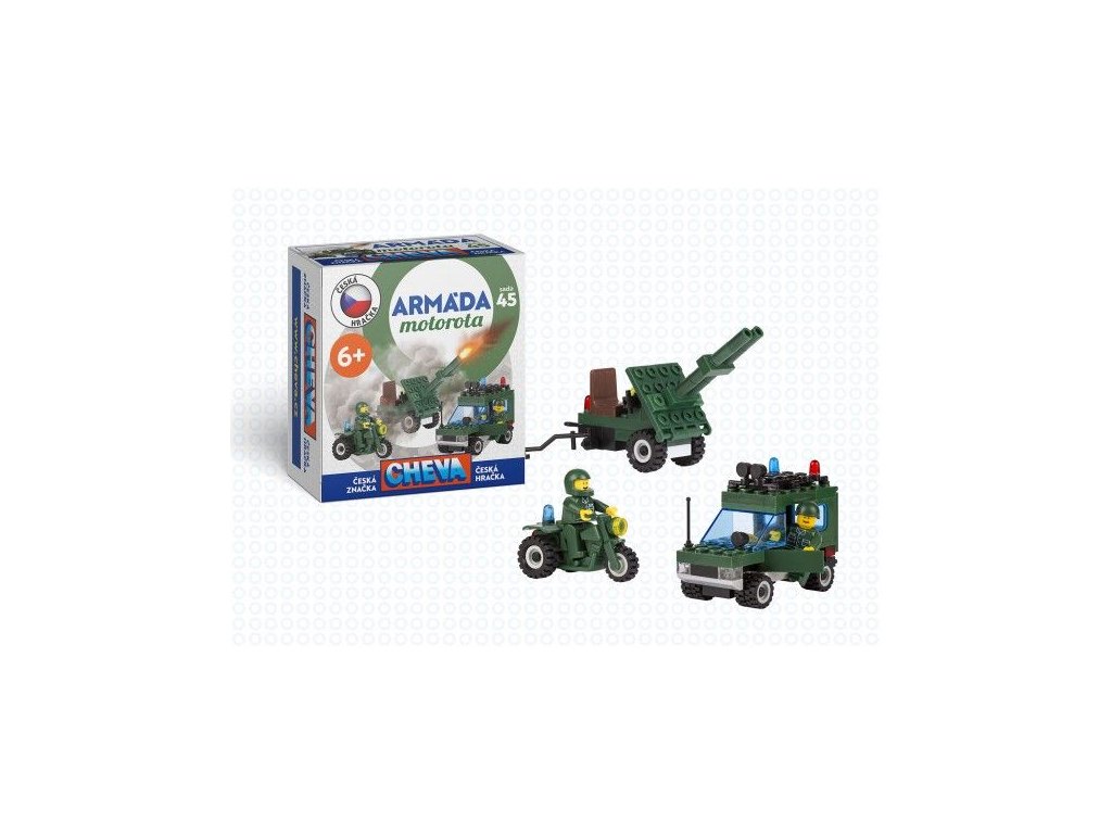 Postavte si vojenský Jeep s dělem. Klasická česká stavebnice Cheva je variabilní a polytechnická stavebnice. Stavebnice Cheva povzbuzuje dětskou zručnost, představivost a kreativitu. Sada obsahuje 123 ks kostek. V krabici 18x19x9 cm. Doporučený věk: od 6 let