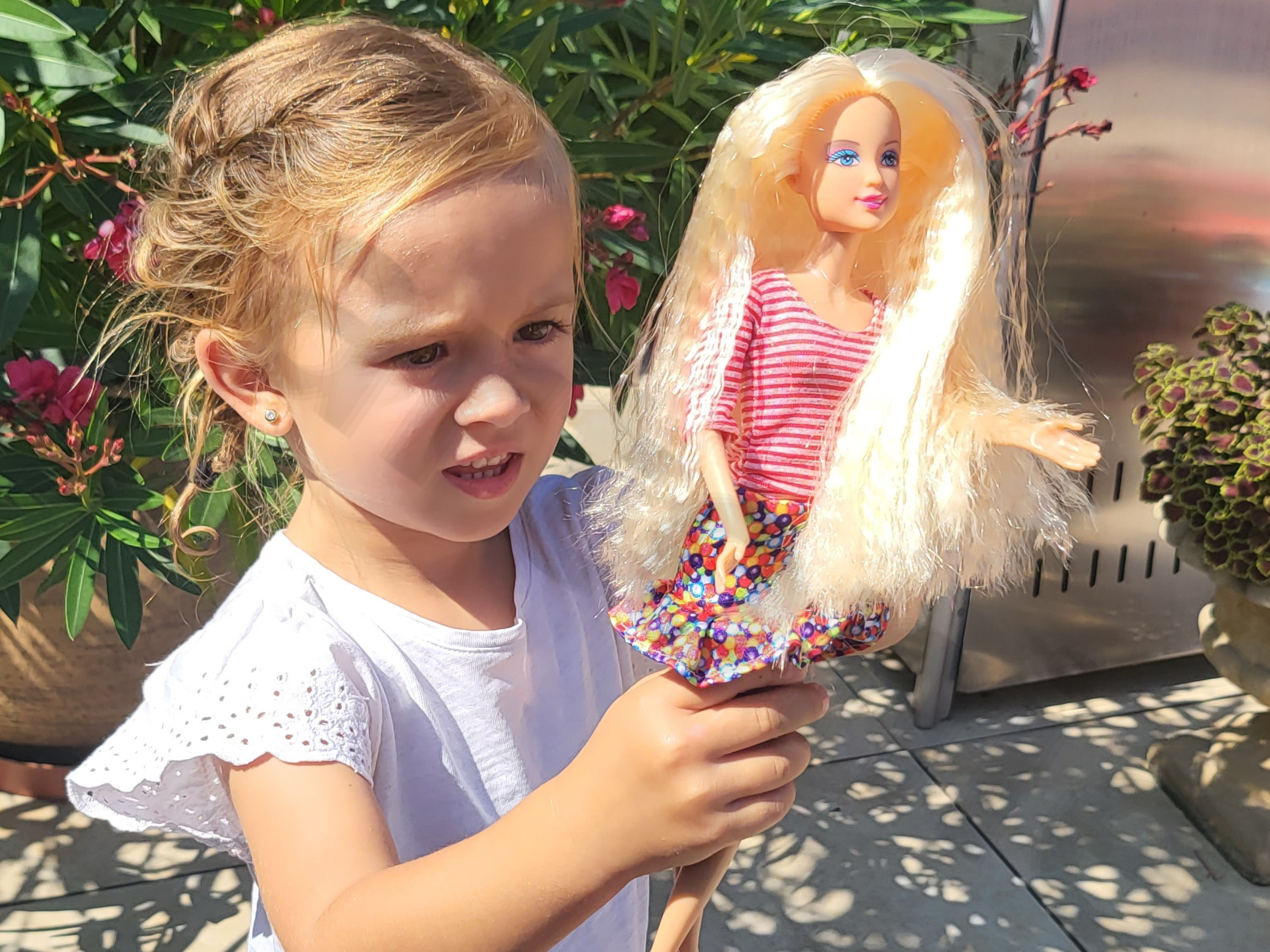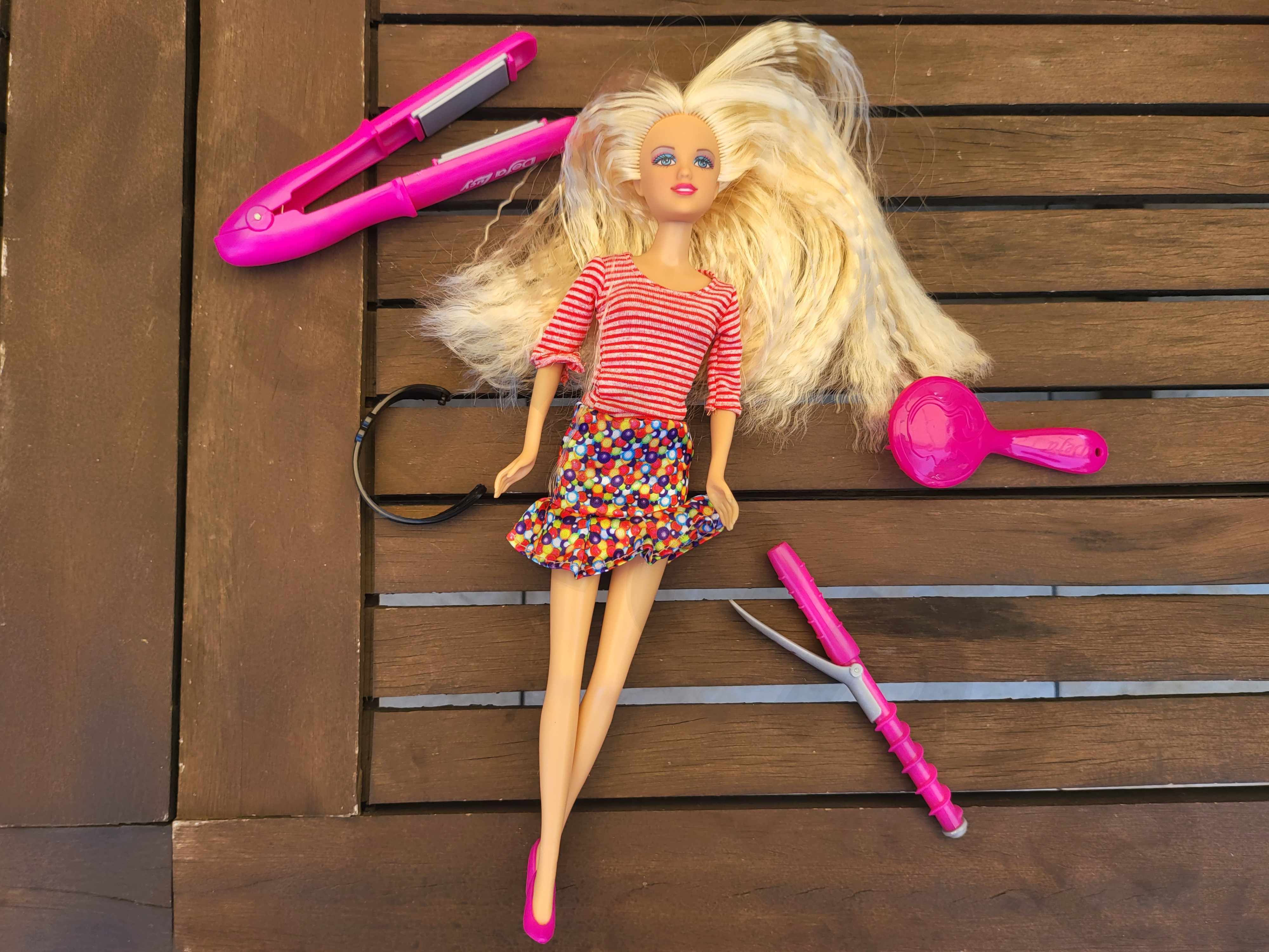 Lucy má dlouhé blond vlásky, které můžeš česat přiloženým kartáčem. Součástí sady je také žehlička na vlasy a kulma.