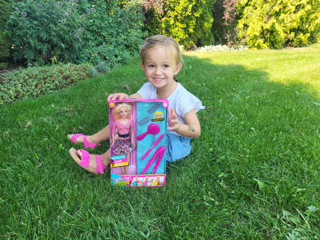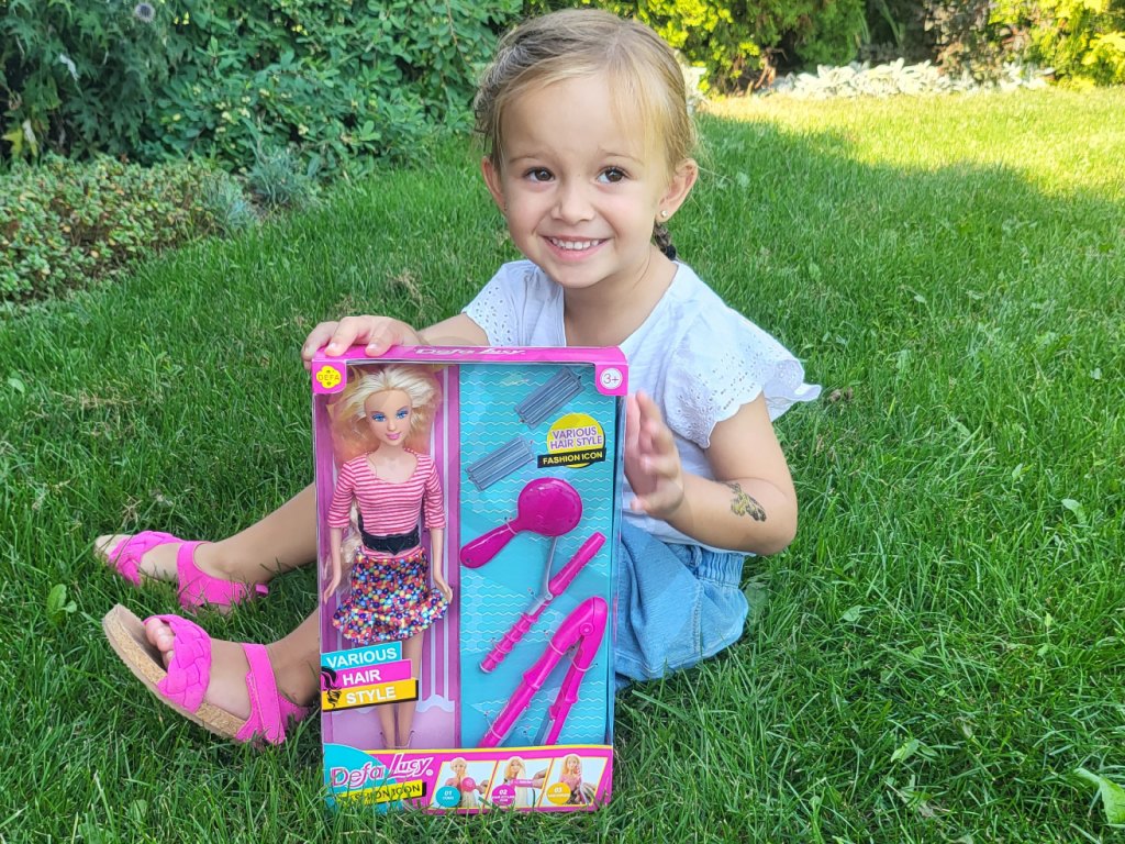 Lucy má dlouhé blond vlásky, které můžeš česat přiloženým kartáčem. Součástí sady je také žehlička na vlasy a kulma.