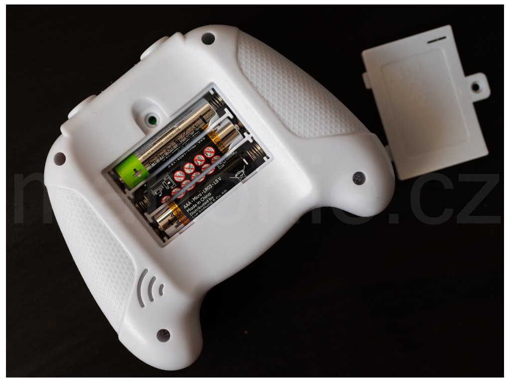 Hračka funguje na 3 AAA baterie (což jsou ty podobné tužkovým, jen menší), které nejsou součástí, takže můžete klidně zvolit dobíjecí variantu. Pokud máte více dětí, doporučujeme koupit ovladač každému dítěti, protože z naší zkušenosti ho nikdo nechce dát z ruky.