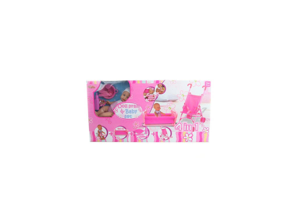 - Sada 4v1 obsahuje: panenku s oblečkem, doplňky na krmení, golf kočárek, postýlku