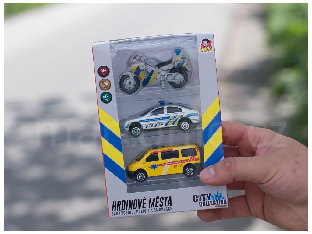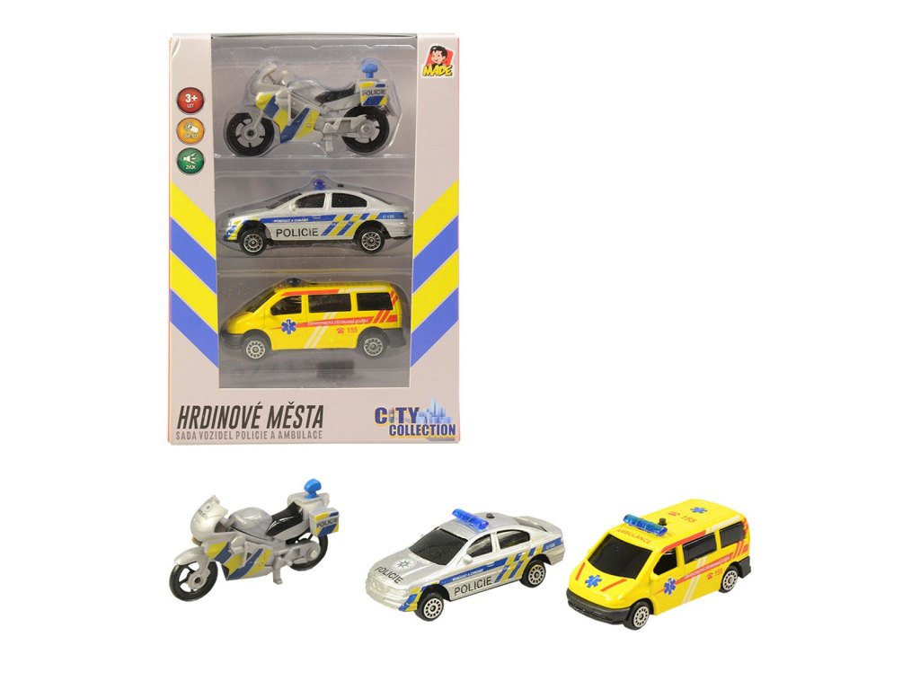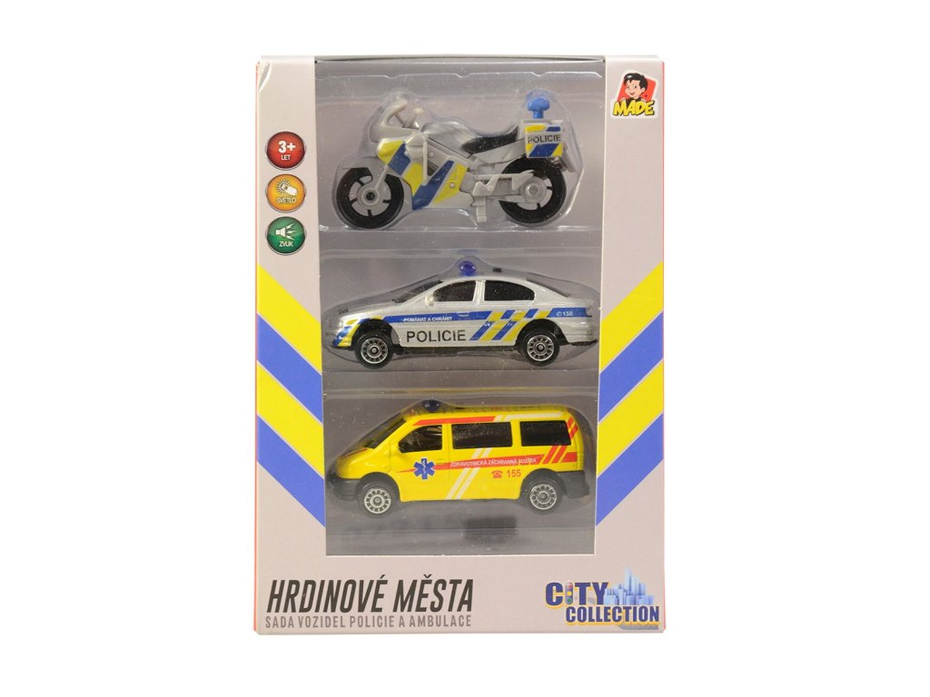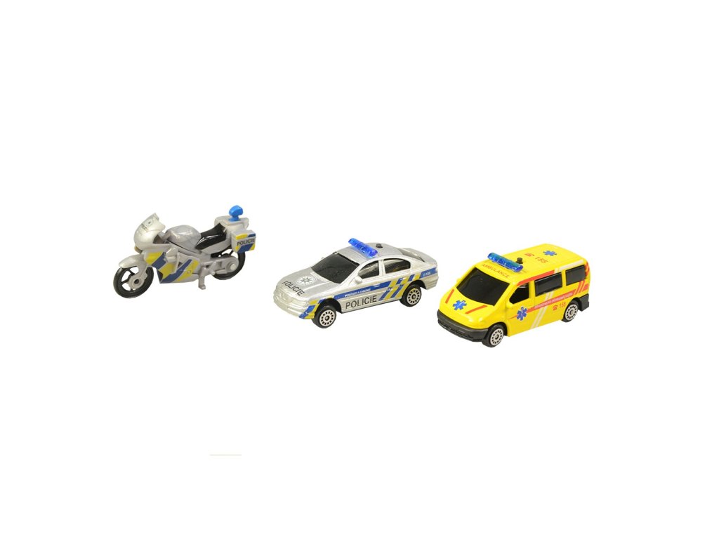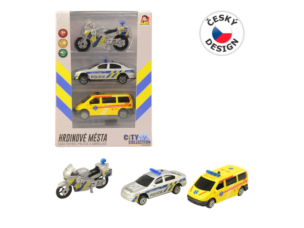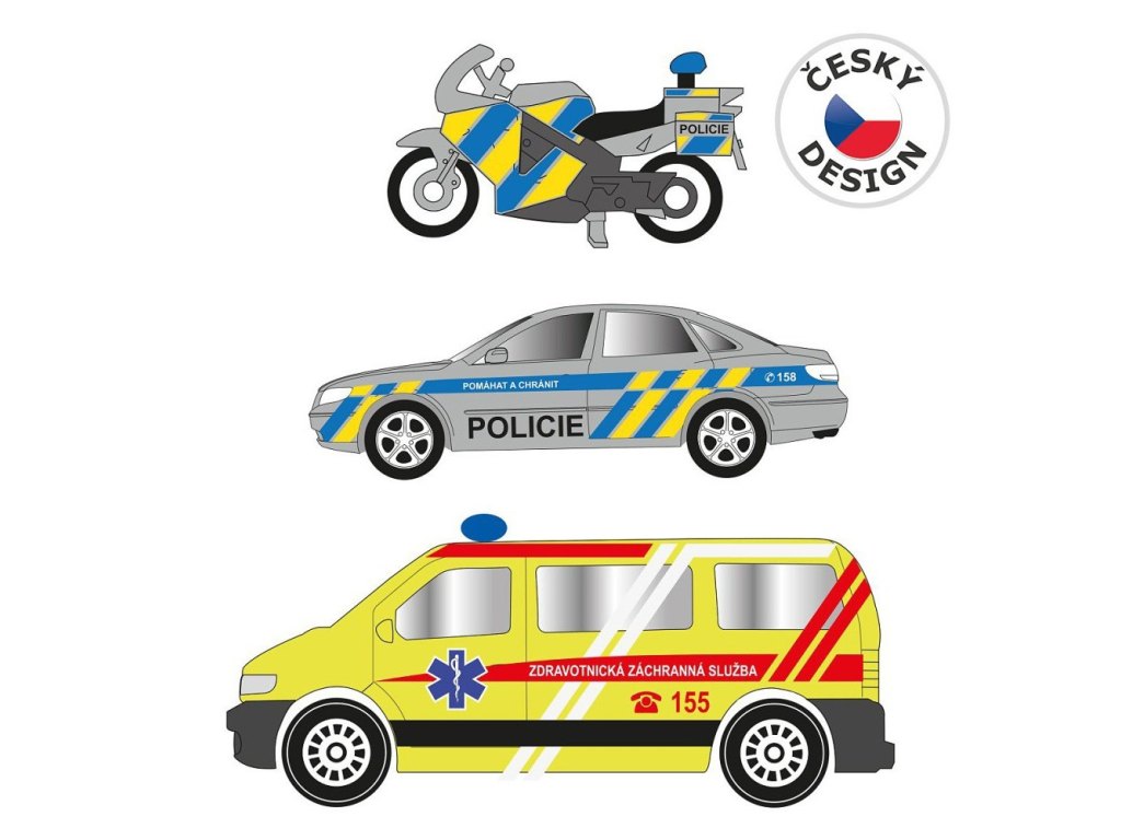 Sada ambulance a policie v českém designu. Znáte z našich silnic. Záchranářská sada policejní motorky (plast), policejního auta a dodávky ambulance (kov a plast) z produktové řady City Collection. Ambulance a auto s houkačkou (světlo a zvuk). Délka motorky: 7 cm. Délka policejního auta: 8 cm. Délka ambulance: 8 cm. Český design. Český box.
