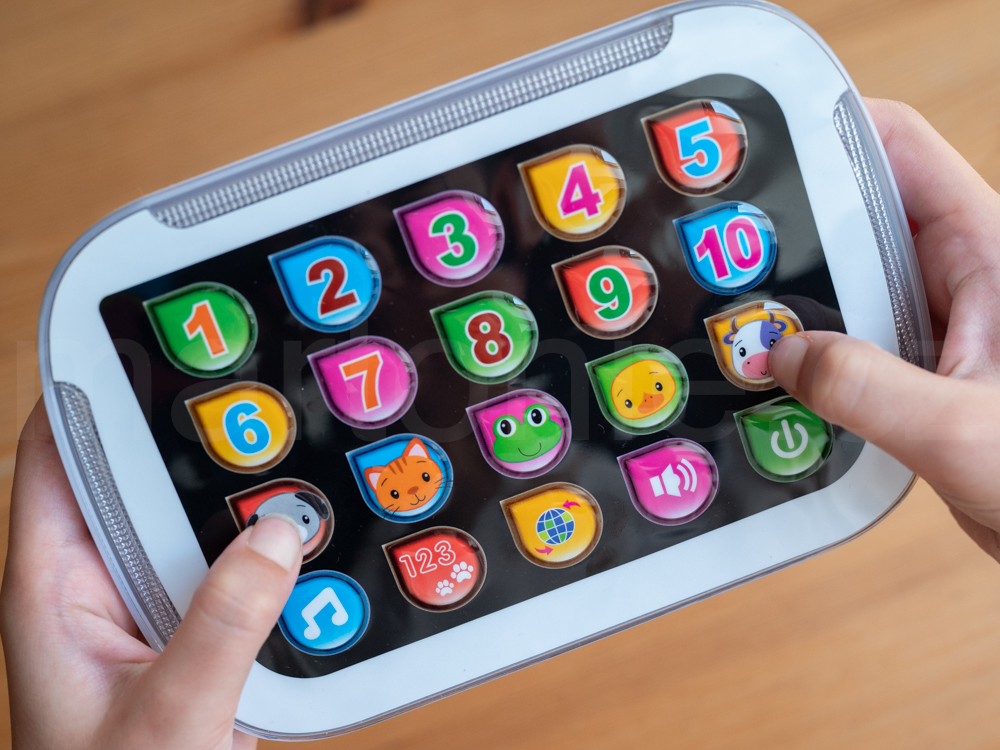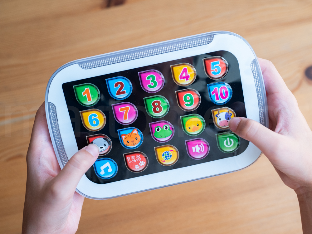 Tablet je lehoučký do ruky, dobře se dětem drží a hlavně je odolný, když ho omylem upustí, nerozbije se. Kromě číslic od 1 do 10 učí i 5 zvířátek - pes, kočka, žába, kačenka, kráva.
