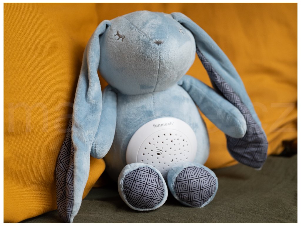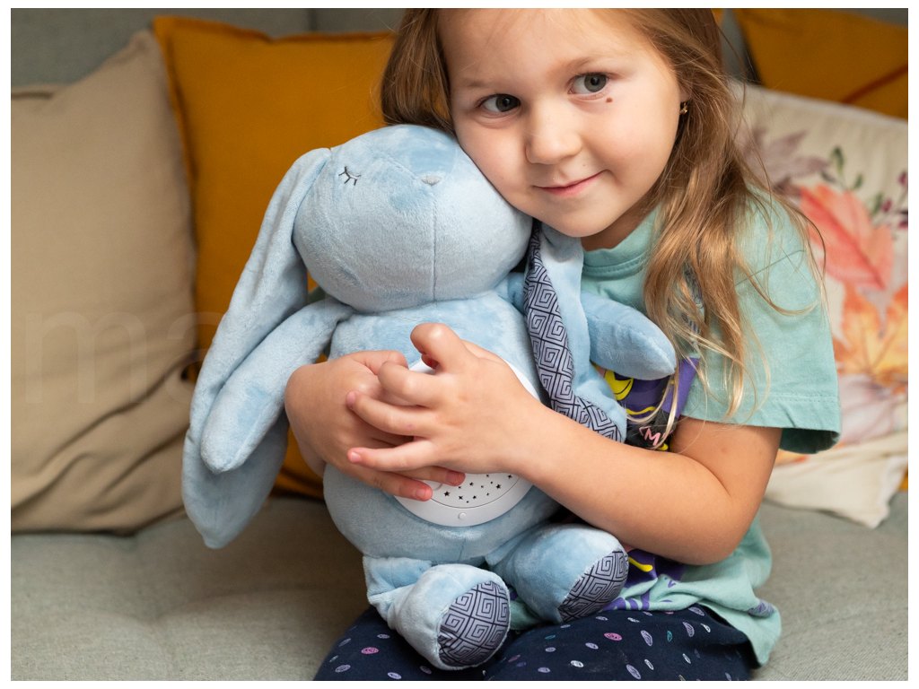 Usínací zajíc s projekcí. Velikost 26 cm. Baterie 3xAAA nejsou součástí. Projektor na bříšku zajíce svítí, hraje a otáčí se. Otočením projektoru proti směru hodinových ručiček se spustí ukolébavka. Projektor jde vyjmout z bříška zajíce. Dozadu projektoru se vkládají baterie. Projekce se zapíná tlačítkem.