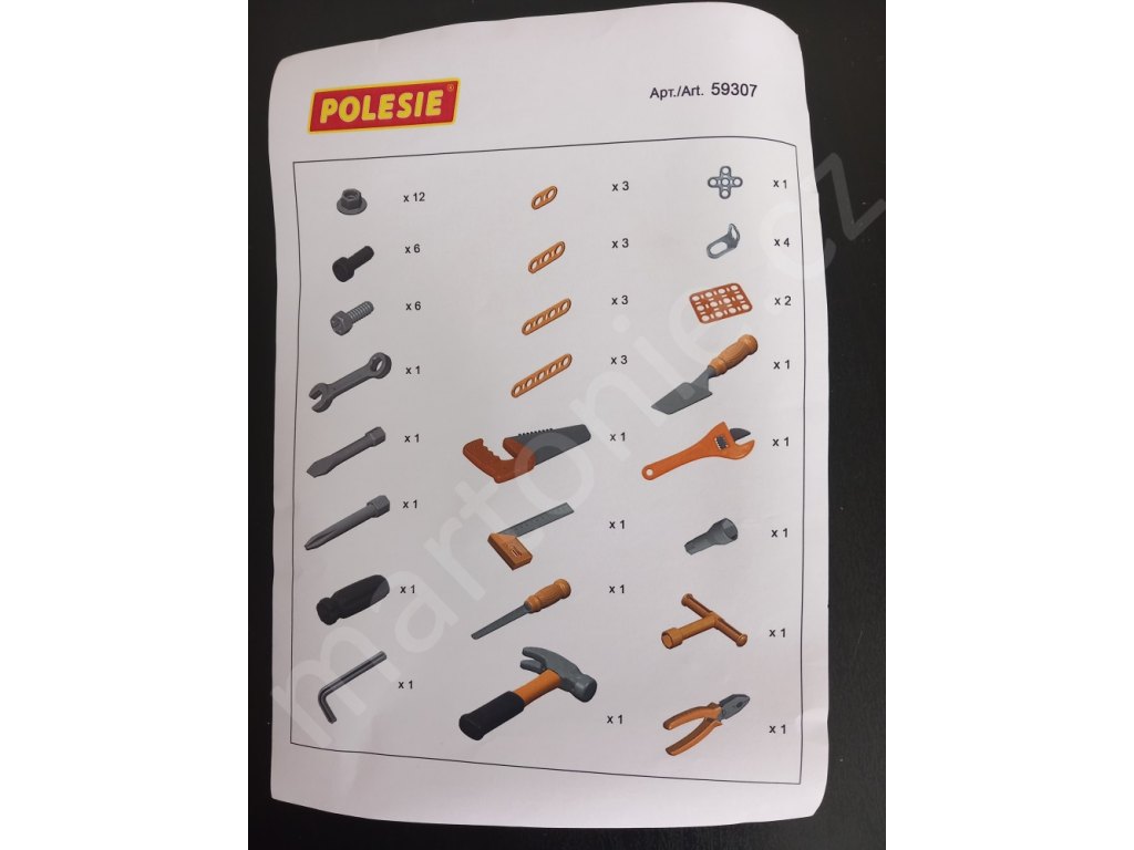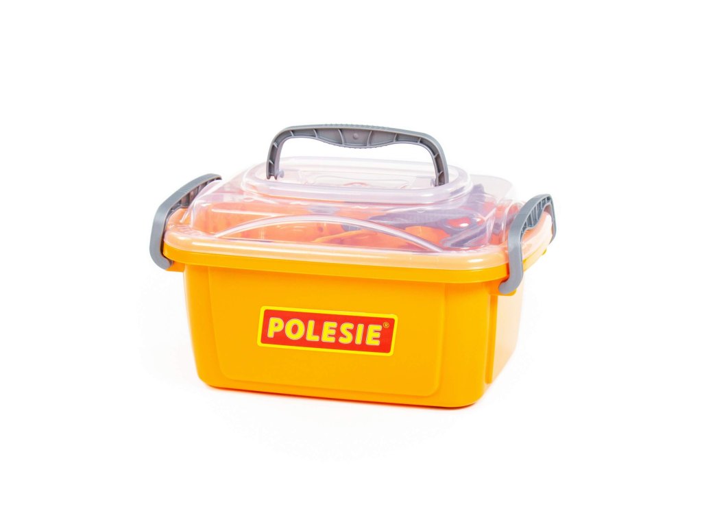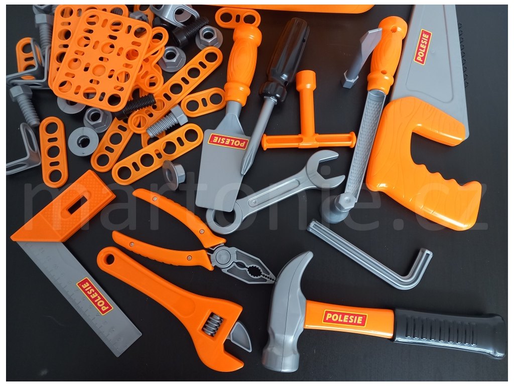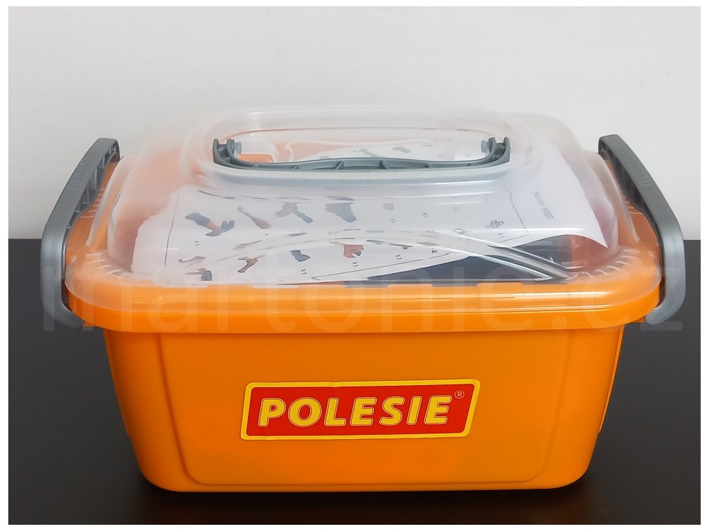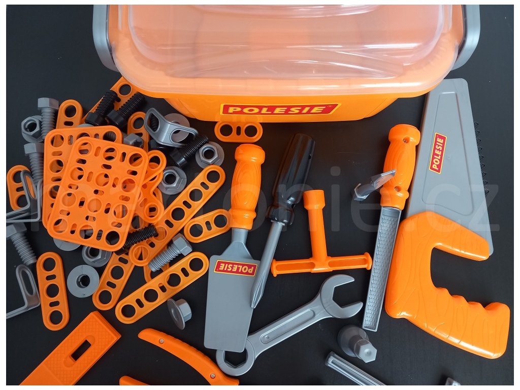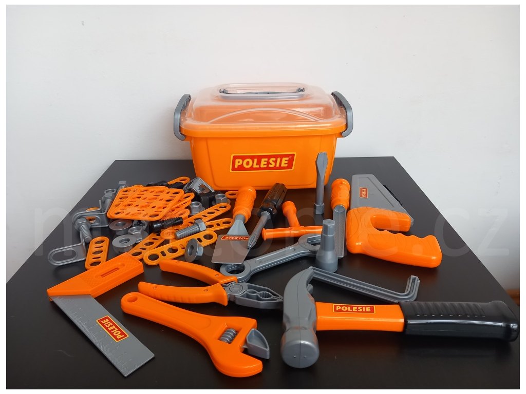 Nářadí je uloženo ve stohovatelném plastovém boxu. Děti si ho mohou snadno přenášet a je vždycky krásně uklizené. Díky tomu, že je nářadí plastové, mohou ho děti brát i ven a pracovat tu s tátou nebo dědečkem. Nářadíčko pak snadno umyjete a osušíte.